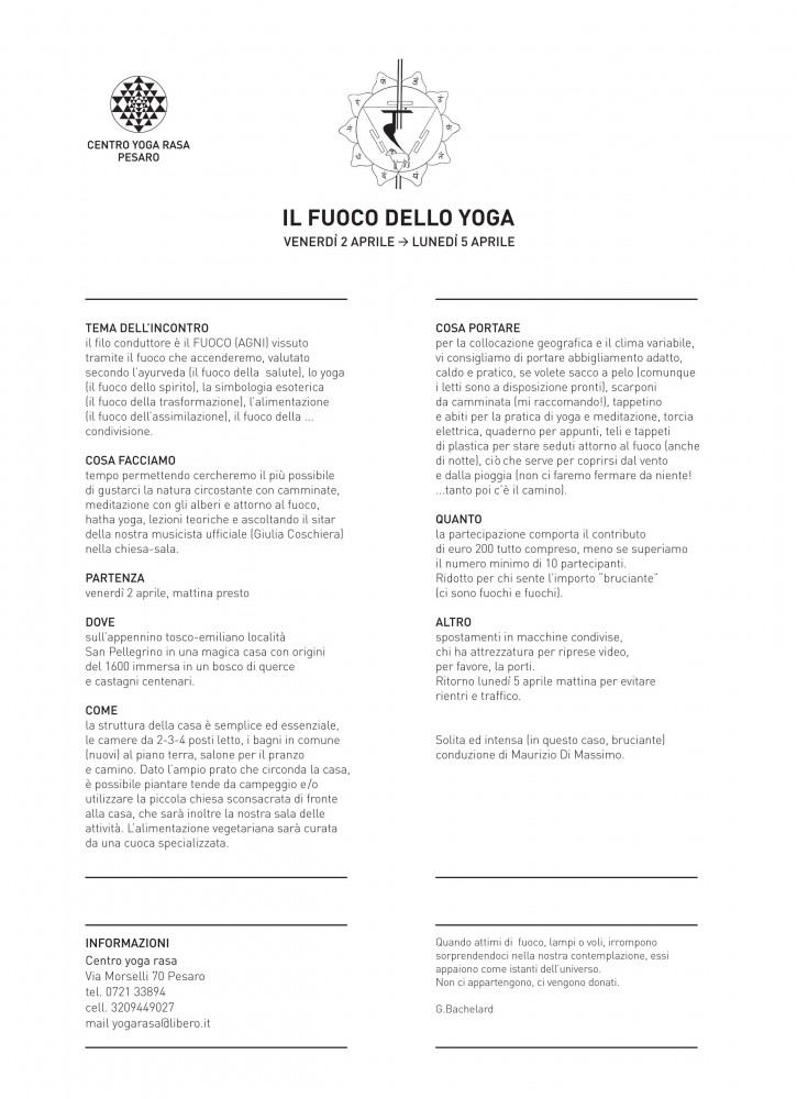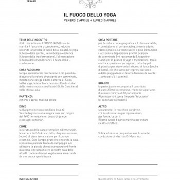 Il filo conduttore è il fuoco (agni) vissuto tramite il fuoco che accenderemo, valutato secondo l’ayurveda (il fuoco della salute), lo yoga (il fuoco dello spirito), la simbologia esoterica (il fuoco della trasformazione), l’alimentazione (il fuoco dell’assimilazione), il fuoco della... condivisione.