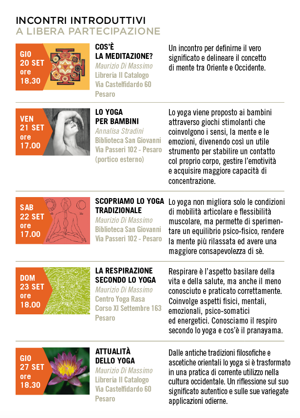I corsi di yoga e meditazione saranno preceduti da conferenze introduttive e lezioni di prova gratuite. Qui sotto il calendario completo.
